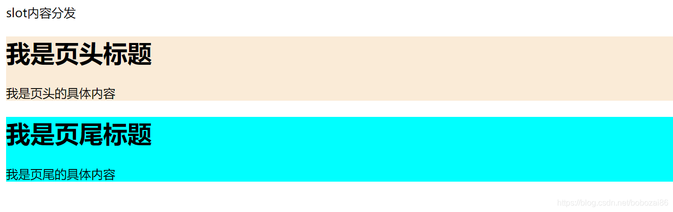 描述:具名插槽其实就是给插槽取个名字。一个子组件可以放多个插槽,而且可以放在不同的地方,而父组件填充内容时,可以根据这个名字把内容填充到对应插槽中。代码如下: 1、子组件的代码,设置了两个插槽(header和footer): <template> <div> <div class="header"> <h1>我是页头标题</h1> <div> <slot name="header"></slot> </div> </div> <div class="footer"> <h1>我是页尾标题</h1> <div> <slot name="footer"></slot> </div> </div> </div> </template> <script> export default { name: "child1" } </script> <style scoped> </style> 2、父组件填充内容, 父组件通过 v-slot:[name] 的方式指定到对应的插槽中 <template> <div> <div>slot内容分发</div> <child1> <template slot="header"> <p>我是页头的具体内容</p> </template> <template slot="footer"> <p>我是页尾的具体内容</p> </template> </child1> </div> </template> <script> import child1 from "./child1.vue"; export default { name: "father1", components: { child1 } } </script> <style scoped> </style> 展示效果 ![]() ![]() 参考: https://www.cnblogs.com/mandy-dyf/p/11528505.html |